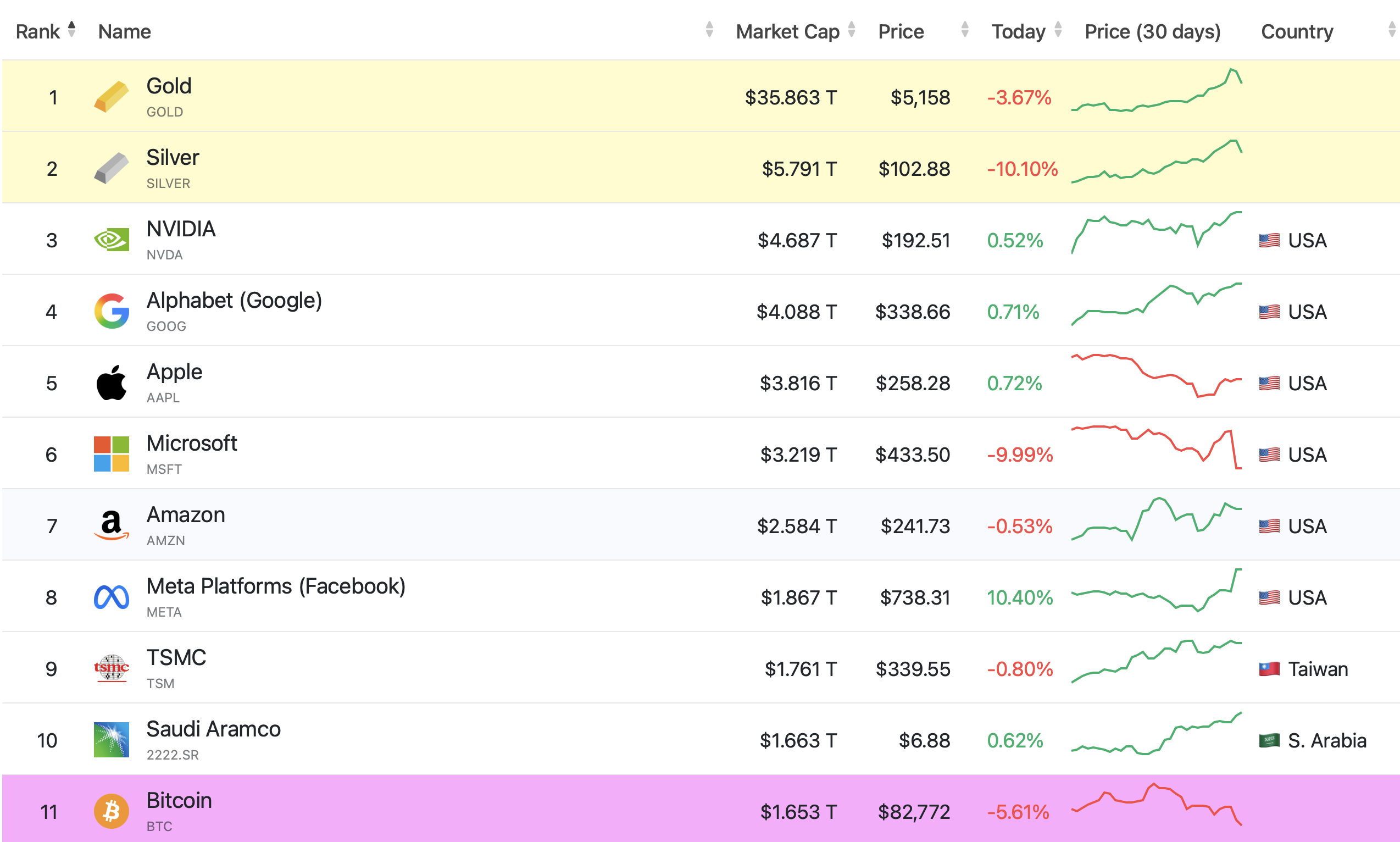 The shift comes as traditional assets and major technology companies continue to dominate the upper ranks, while Bitcoin’s market value contracts alongside a notable short-term price decline.