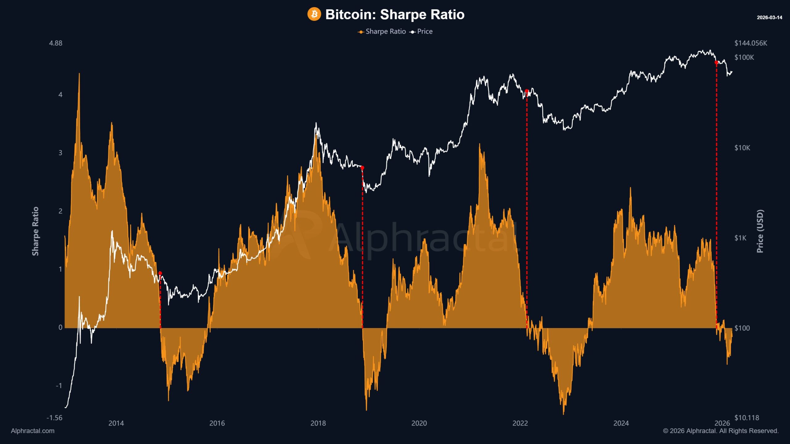 On-chain analytics firm Alphractal added another layer to the picture. Bitcoin’s Sharpe Ratio – a measure of return relative to risk – has turned negative.