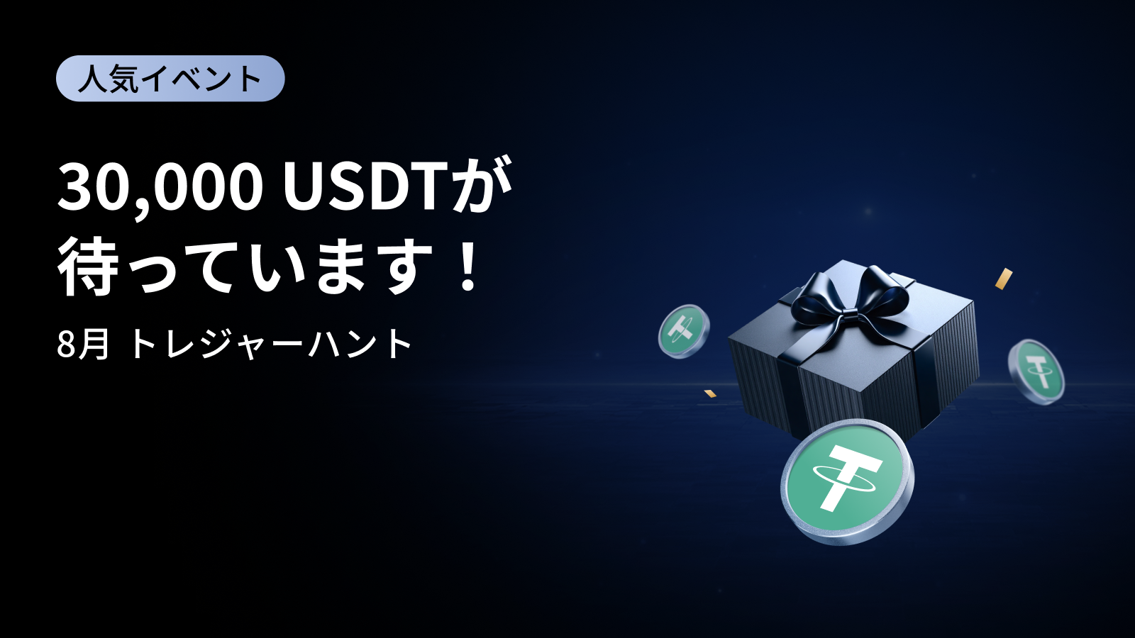 MEXCで“お宝”を探そう!「8月 トレジャーハント」に参加して、30,000 USDTの賞金を山分けしましょう。新規ユーザー様も、既存ユーザー様も、誰にでもチャンスがあります!