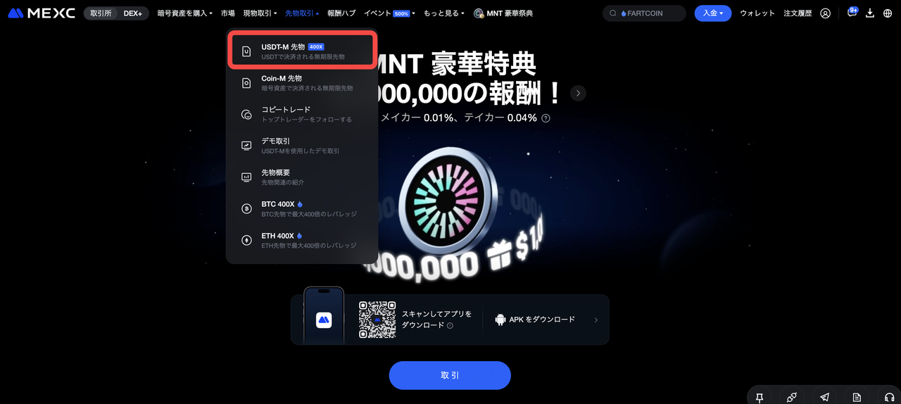 ステップ 1: MEXCトップページの [先物取引] タブから [USDT-M先物] を選択します。