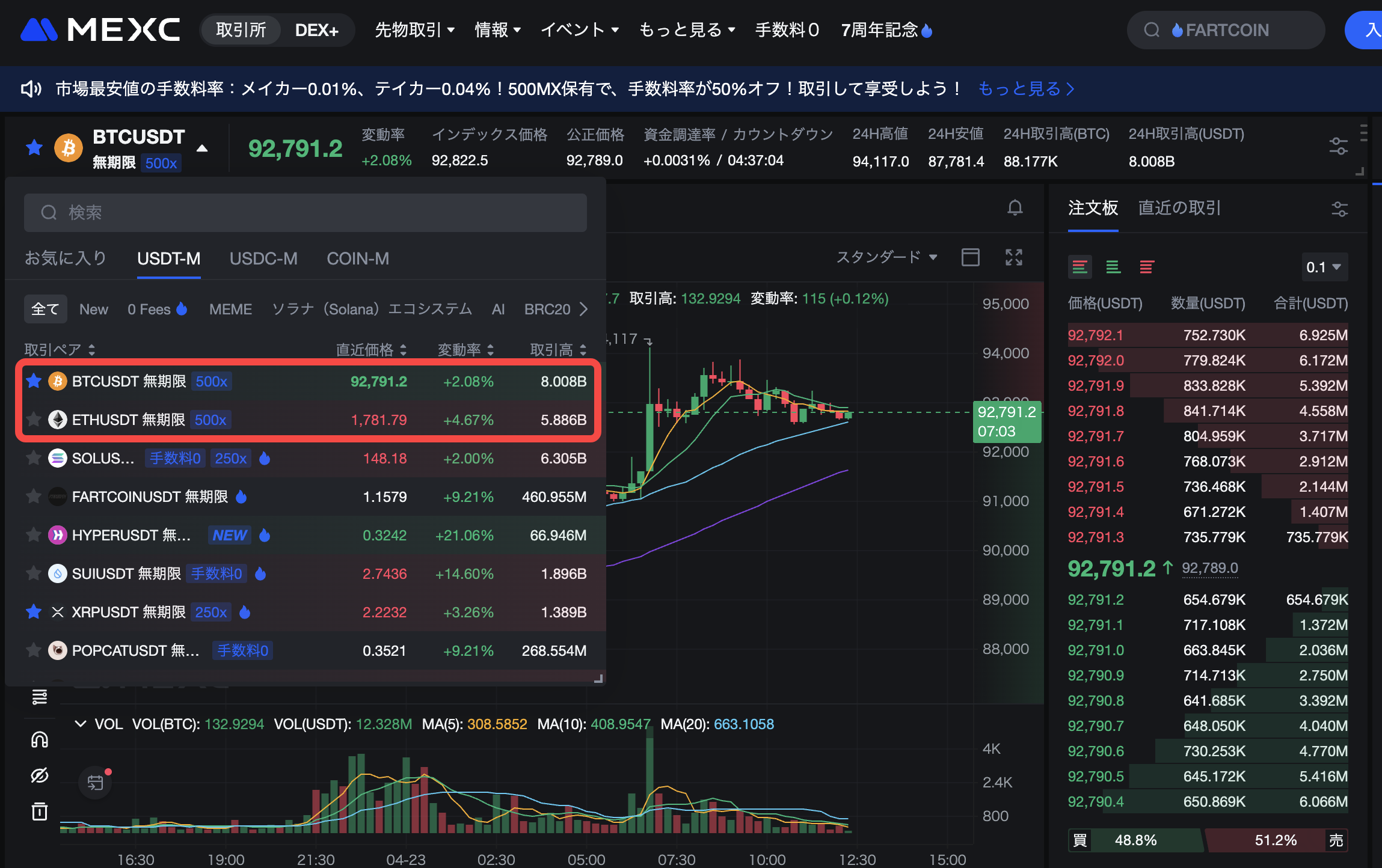 ステップ 2: 500倍のレバレッジに対応した取引ペアを選択します。現在はBTCUSDT、ETHUSDTが対応しています。