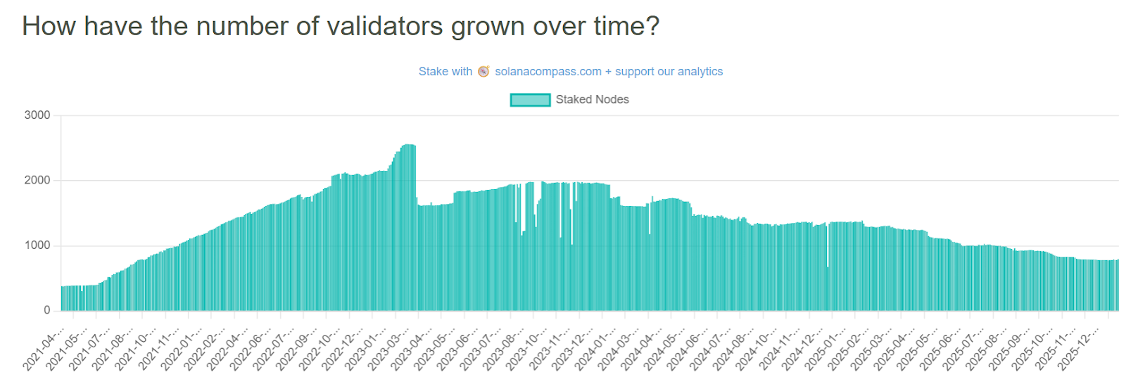 According to data from Solana Compass, the number of active validators has fallen from about 2,560 in early 2023 to roughly 795 today, a 68% drop. Validators are the machines that vote on blocks and keep the chain running. Fewer validators means fewer independent actors securing the network.