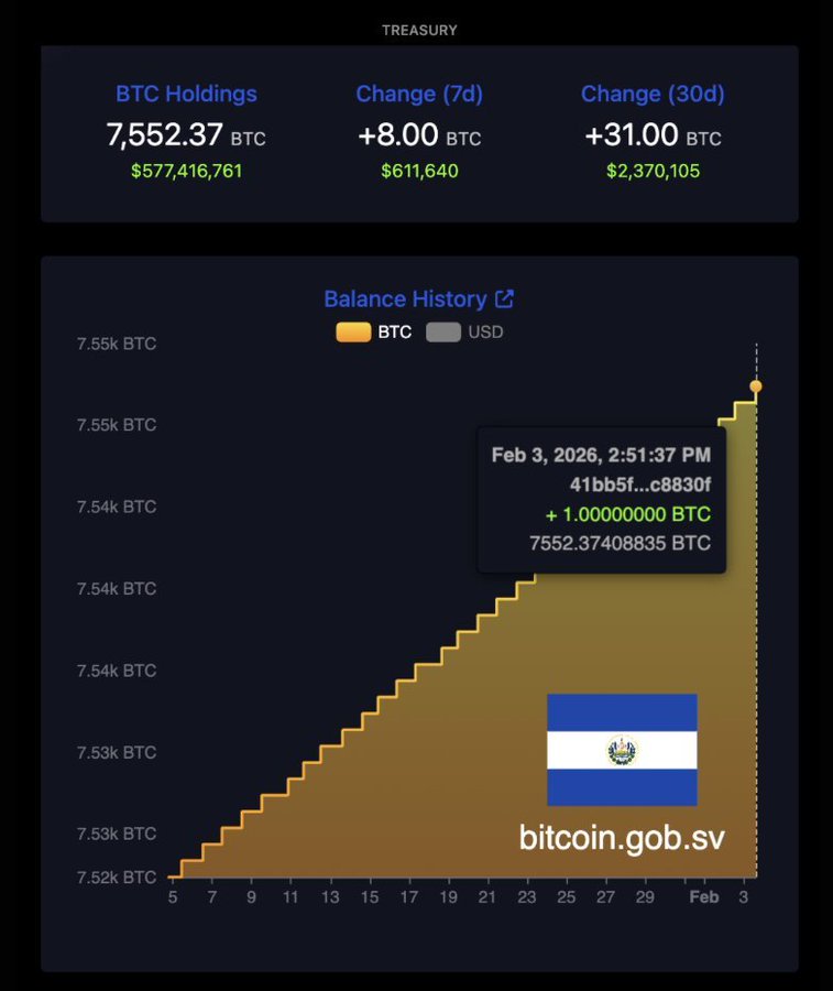 El Salvador has continued adding to its Bitcoin reserves despite ongoing market weakness, with on-chain data showing another 1 BTC inflow to government-controlledEl Salvador has continued adding to its Bitcoin reserves despite ongoing market weakness, with on-chain data showing another 1 BTC inflow to government-controlled
