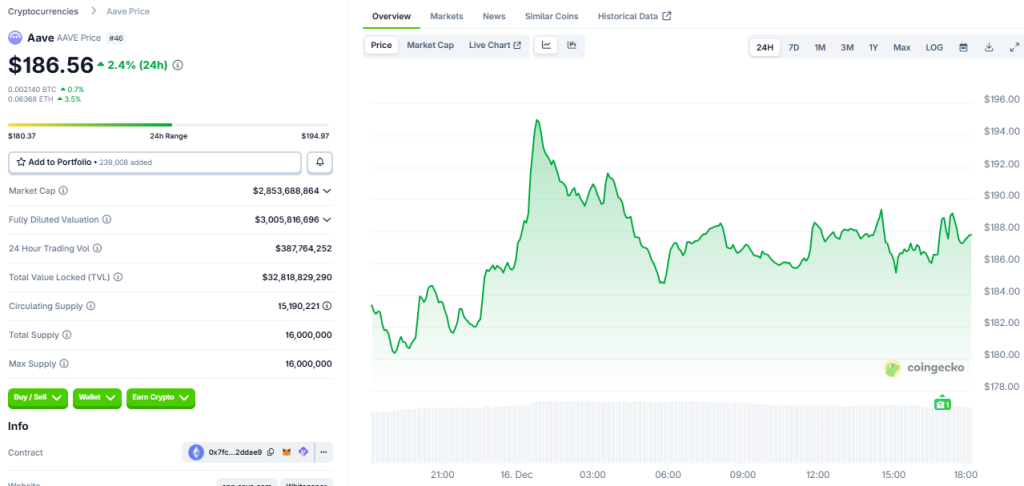 Notably, earlier today, the Aave (AAVE) token reached a high of $194 before dipping to a low of $184. The token has since stabilized at $187.67, marking a 2.4% gain over the past 24 hours.