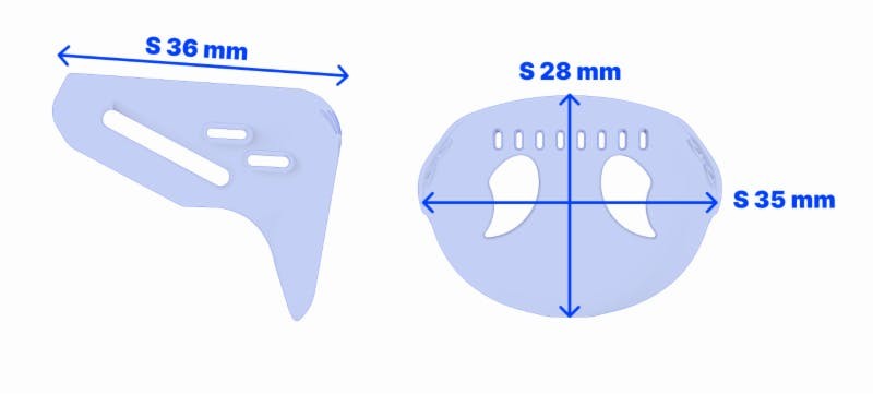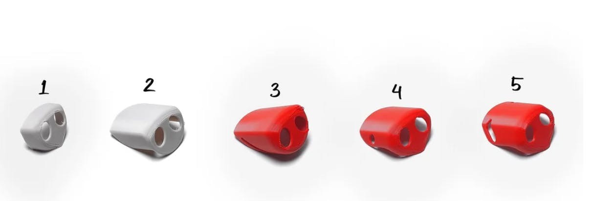 初版以硬質 PLA 材料列印,後來改用柔軟 TPU 材料以增加舒適度。產品尺寸約長 6.5 公分、寬 3.5 公分,厚度 2 毫米,表面設計有 10 個通風孔,確保呼吸順暢,並配有可調整魔鬼氈帶固定。經過 13 次的改良,防護罩能阻擋紫外線,保護鼻子不受摩擦傷害,同時不影響狗狗日常活動或進食。使用後 5 個月,比利鼻子顏色逐漸恢復,疼痛也緩解。