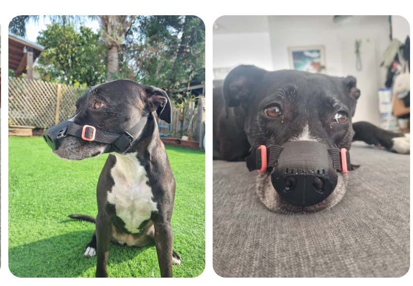 美國一位飼主的狗狗比利因皮膚病所以鼻子比較脆弱,但塗抹藥膏或防曬時又常被舔掉,傳統包布也易滑落。為解決這個問題,奴才飼主利用 3D 列印技術量身訂作出鼻部防護罩。